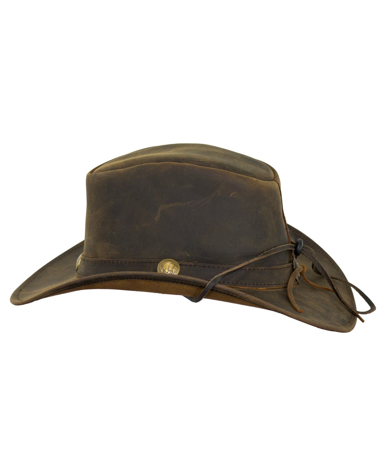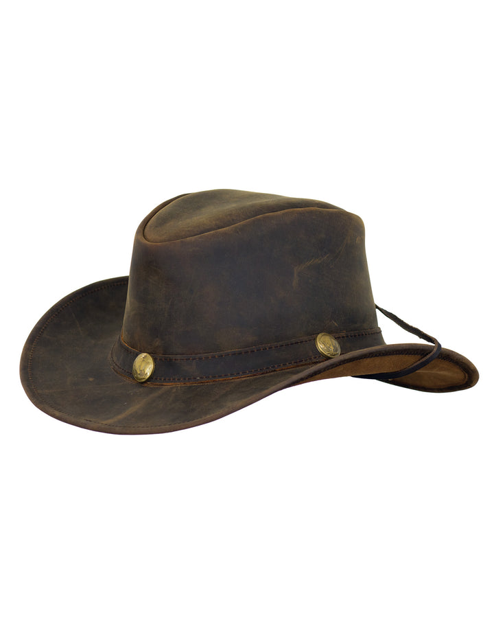 The Cheyenne hat is made from premium leather with a leather hat band adorned with a gold buffalo medallion that gives you a vintage style.