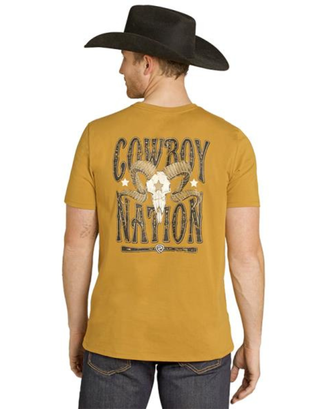 Gold short-sleeved T-shirt with a large white ram's skull between two stars on the back, and the inscription "Cowboy Nation". Relaxed fit for an edgy and bold western look.