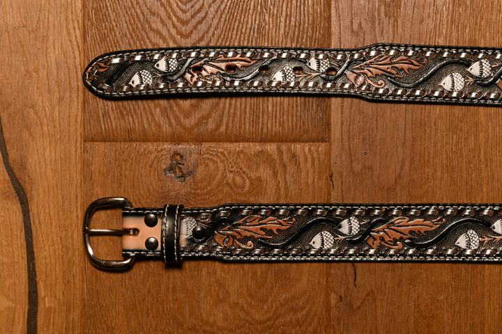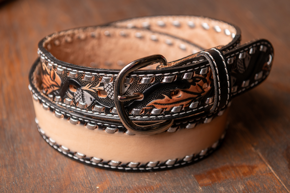 Cette ceinture western de 4 cm de large est réalisée en cuir bicolore avec une large bande claire mise en valeur par un liseré noir orné de motifs détaillés et de surpiqûres apparentes. La boucle arrondie en métal argenté apporte une touche lumineuse tout en laissant la part belle au travail décoratif du cuir.