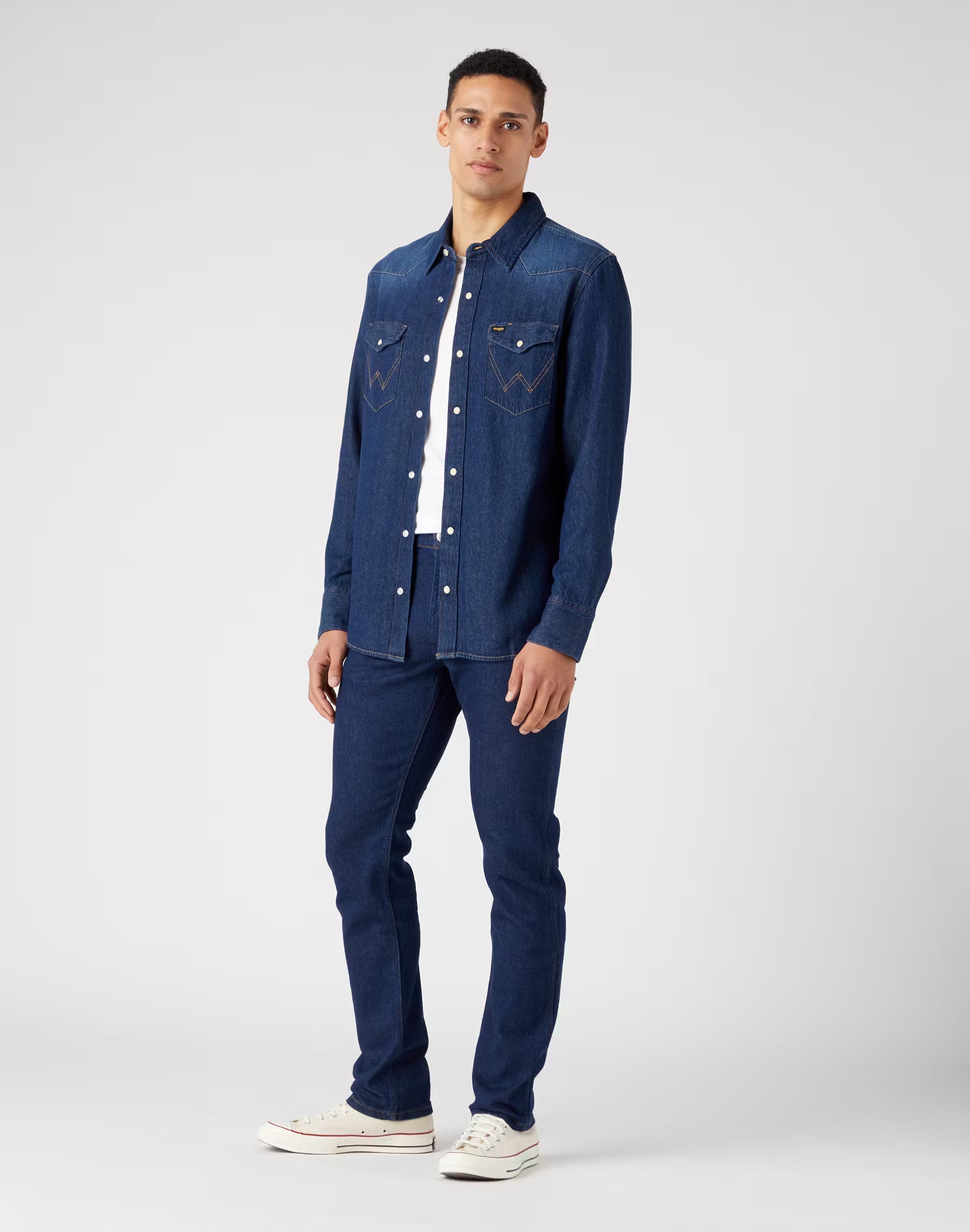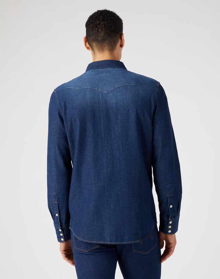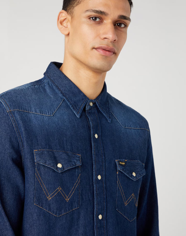 La chemise en jean Wrangler iconique en couleur darkstone avec de solides boutons-pression.