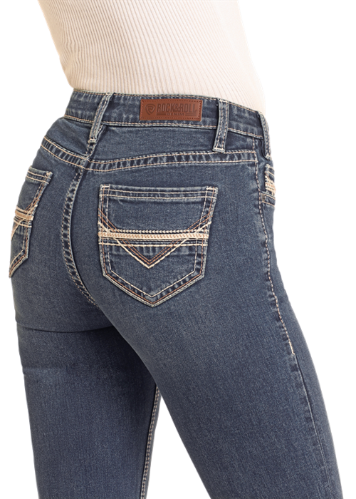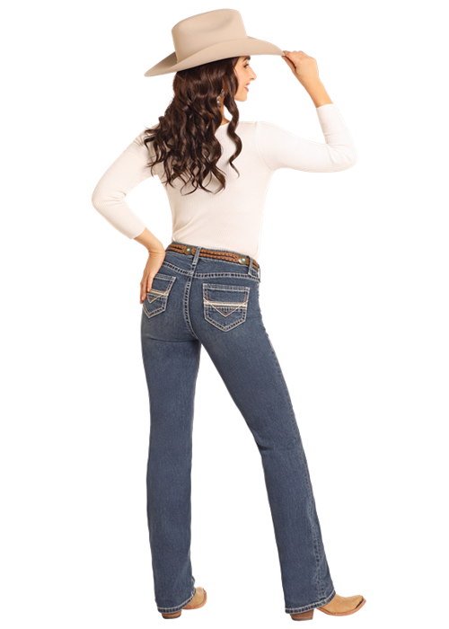 Jean taille mi-haute bootcut extra stretch avec une broderie en V blanche et brune sur les poches arrières.