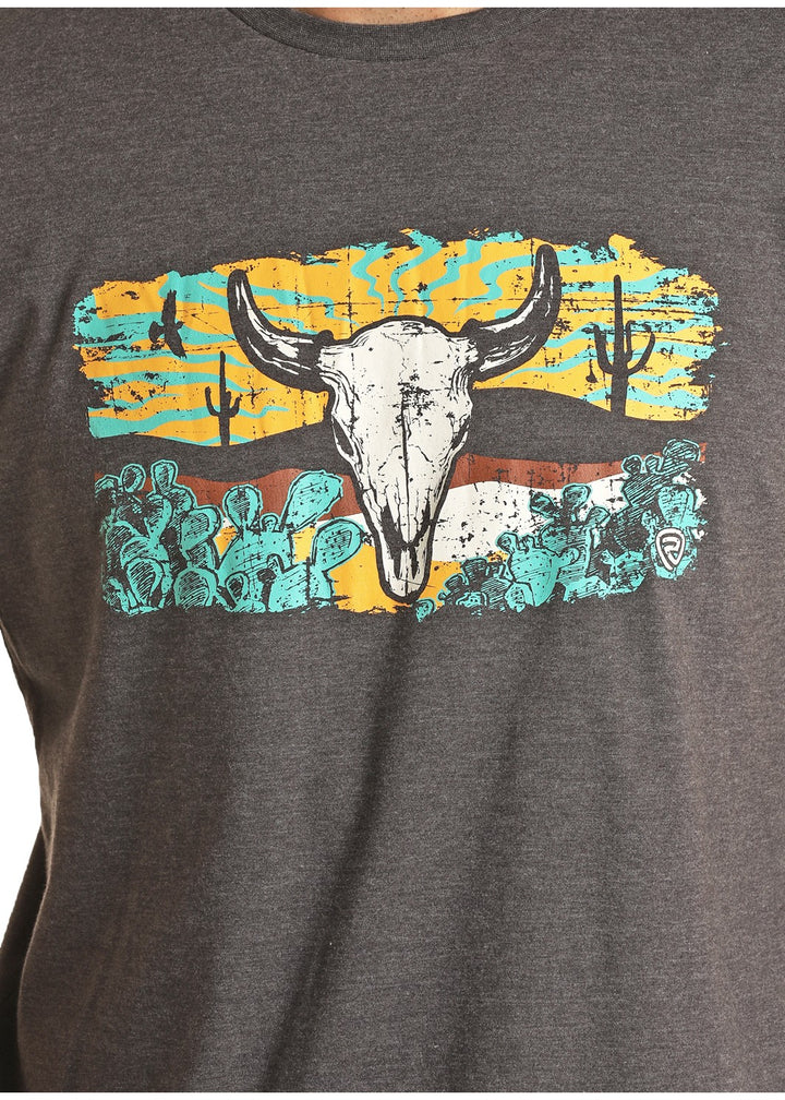 T-shirt gris à col rond avec un graphique de crâne de vache.