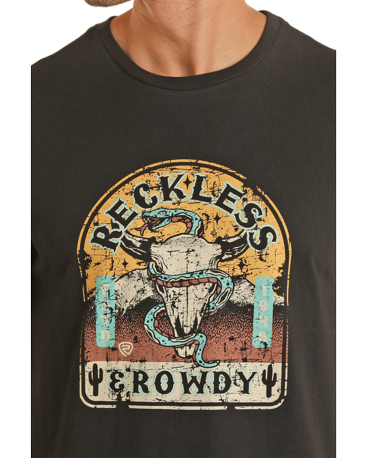 T-shirt western noir avec print oversize circulaire Reckless Rowdy crâne de taureau sur fond dégradé désert. Col rond, manches courtes pour look cowboy rebelle audacieux.