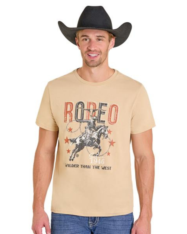 T-shirt beige clair manches courtes avec graphique rodeo vintage : cowboy à cheval dynamique, écrit Rodeo Wilder Than West. Coupe décontractée pour un vibe western authentique et passionné.