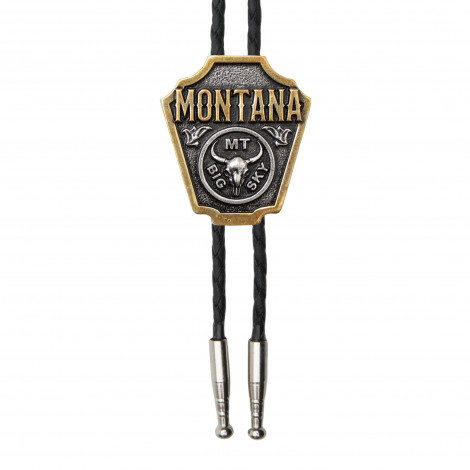 Bring authentic western flair to your outfit with this "Montana Big Sky" bolo tie. Features an antique gold and silver medallion with Montana lettering and steer skull, black braided leather cord and silver tips. A great choice for country and rodeo styles!