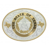 Small, oval cast brass belt buckle with polished wire trim. Large lettering spelling out Colorado stretches boldly across, surrounded by a set of...