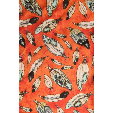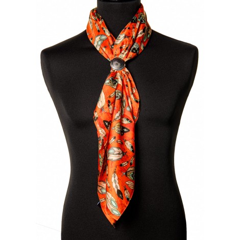 Beautiful orange silk scarf with feathers print the perfect accessory to add a touch to your western style.