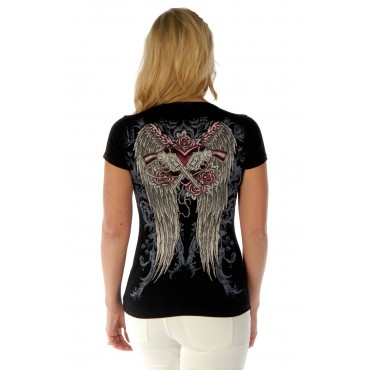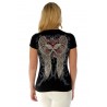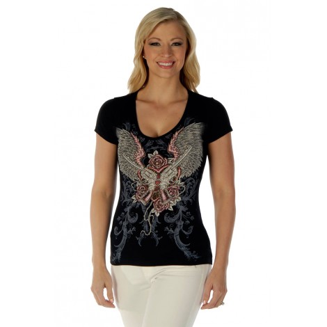 A scoop neck tee featuring teal and mocha headdress embellished with rhinestones.