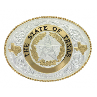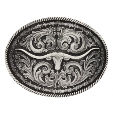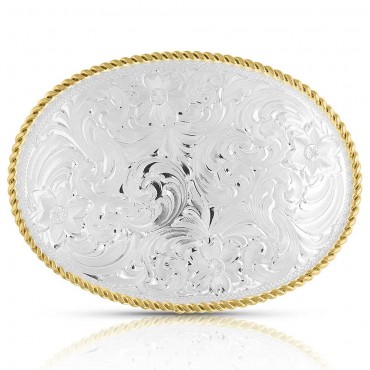 Boucle de ceinture de taille moyenne en argent de forme ovale entièrement gravée de volutes traditionnelles western. Garniture en corde torsadée...