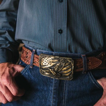 Boucle de ceinture ovale en laiton moulé avec garniture en fil métallique poli. L'état du Colorado est écrit en gros caractères et entouré d'une...