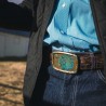 Boucle de ceinture de taille moyenne en argent de forme ovale entièrement gravée de volutes traditionnelles western. Garniture en corde torsadée...
