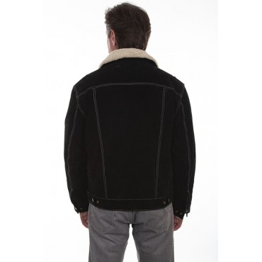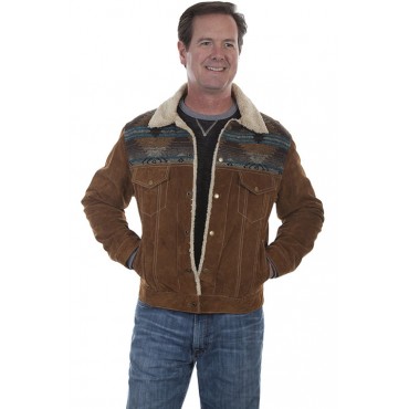 Cette belle veste en daim avec un magnifique empiècement en tricot de style aztèque. Elle se ferme par des boutons pression sur le devant, avec un col en pointe en faux shearling et une doublure intérieure. Elle comporte deux poches à rabat sur la poitrine avec fermetures à bouton pression, deux poches d'entrée latérales inférieures et deux fermetures à bouton pression pour ajuster la taille. L'intérieur est doublé en faux shearling et les manches sont doublées en nylon avec des poches intérieures.